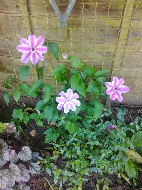 The pink striped clematis is doing well - it's the second one we bought and is going great guns. There's another bud at least to come.